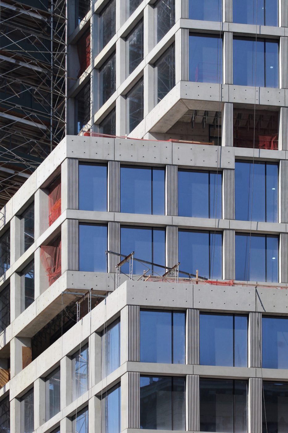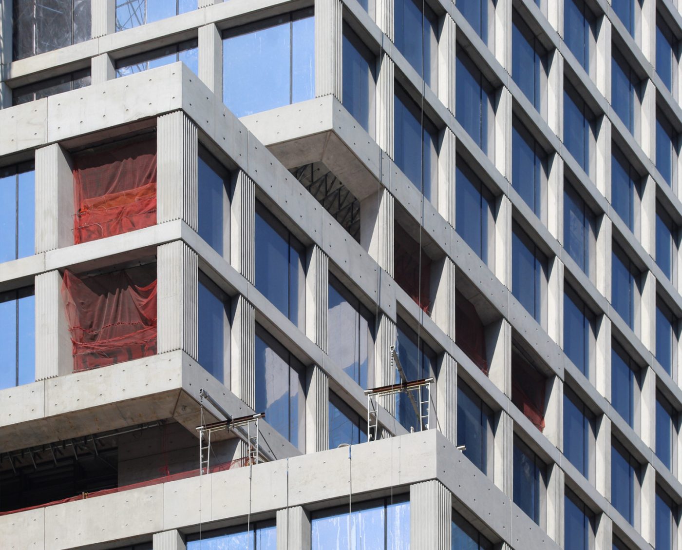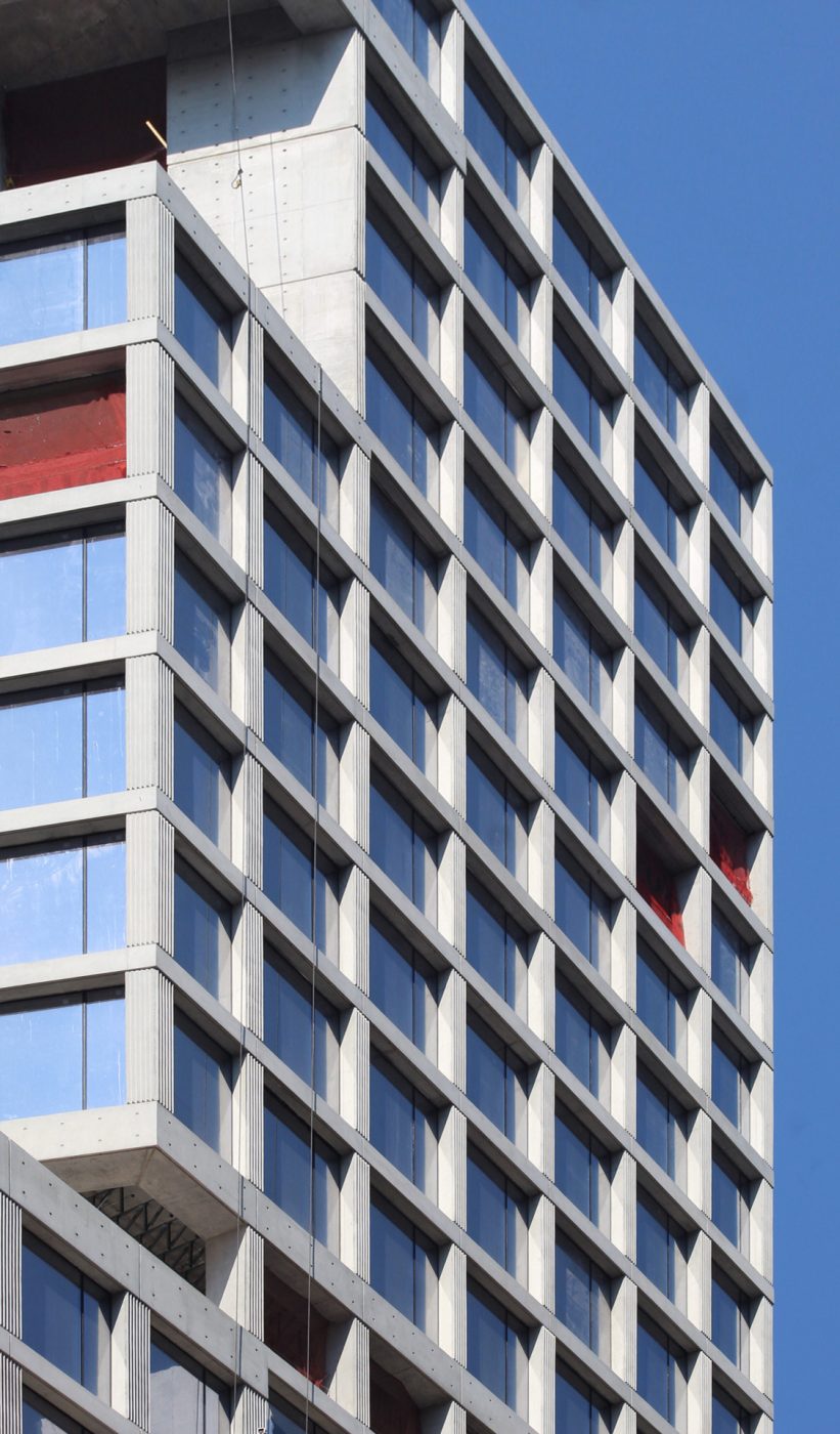 There are only a handful of glass panels left to be installed, as well as those that will fill in the gap where the exterior hoist on the eastern elevation facing Broadway is still attached. Because they are not flush with the concrete surface, the result is shadows that create a subtle layer of depth and highlight the rigid reinforced concrete edifice. This appearance is best seen in the morning while the sunlight hits both the eastern and northern sides of the office building. There are vertical grooves on the columns between each window, while the horizontal members along the edges of each floor plate and setback are cleanly smoothed out. Some of these have shallow holes arranged in a grid, and can also be spotted around the tall blank walls that surround the open-air voids as part of the numerous terrace spaces.