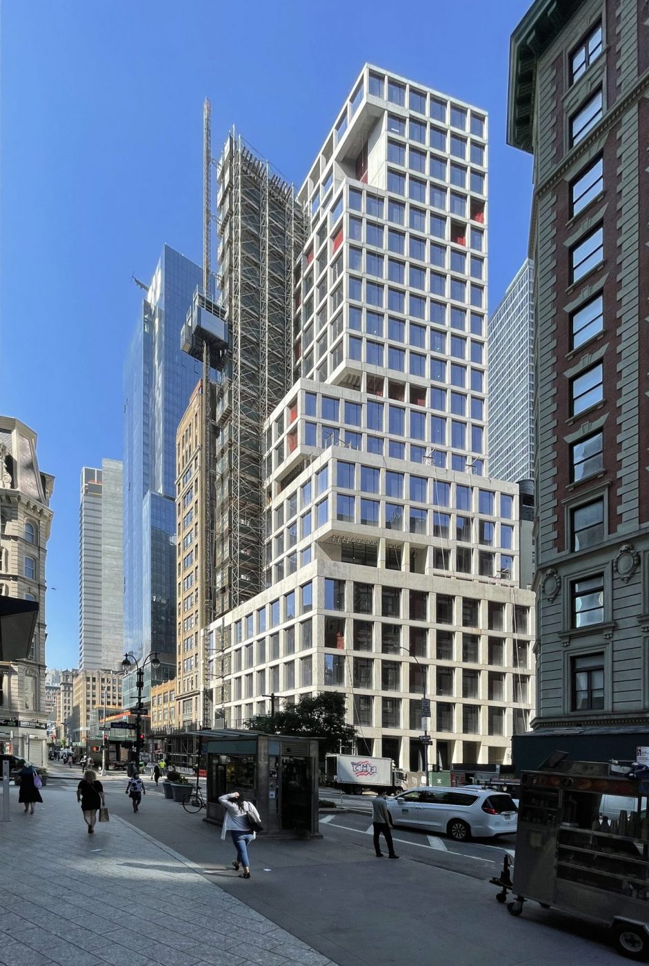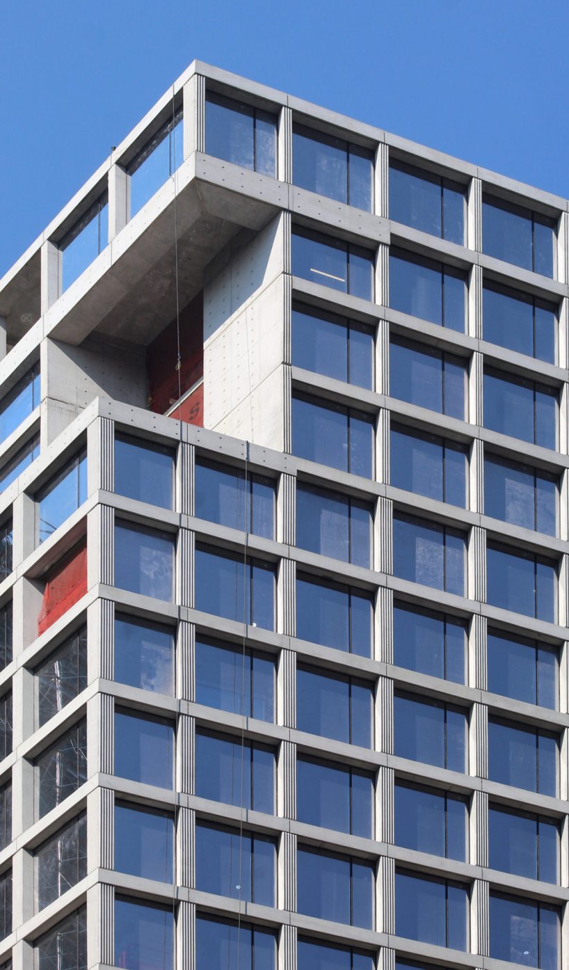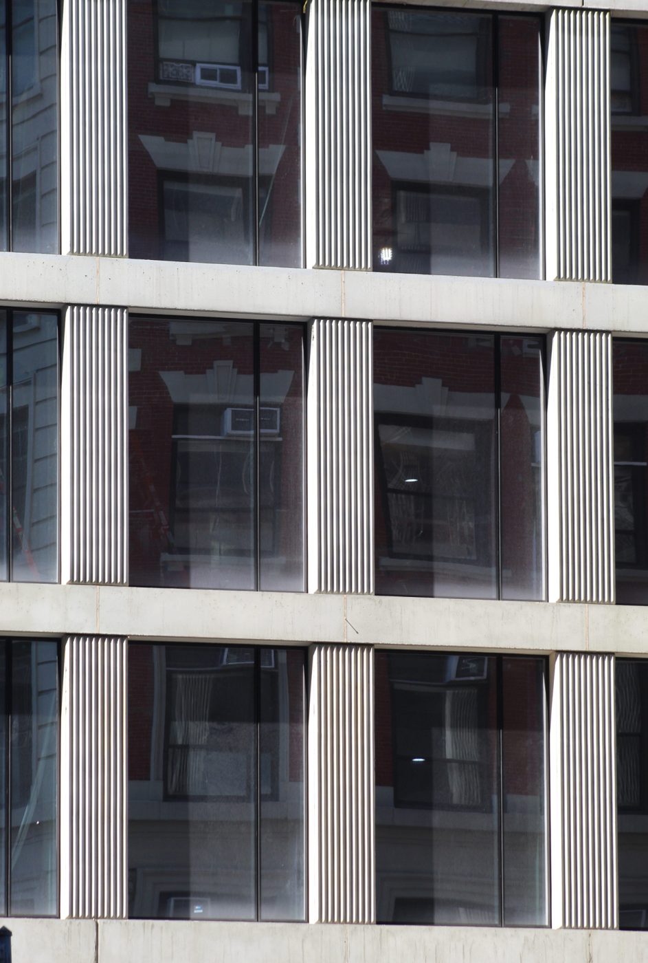 There are only a handful of glass panels left to be installed, as well as those that will fill in the gap where the exterior hoist on the eastern elevation facing Broadway is still attached. Because they are not flush with the concrete surface, the result is shadows that create a subtle layer of depth and highlight the rigid reinforced concrete edifice. This appearance is best seen in the morning while the sunlight hits both the eastern and northern sides of the office building. There are vertical grooves on the columns between each window, while the horizontal members along the edges of each floor plate and setback are cleanly smoothed out. Some of these have shallow holes arranged in a grid, and can also be spotted around the tall blank walls that surround the open-air voids as part of the numerous terrace spaces.