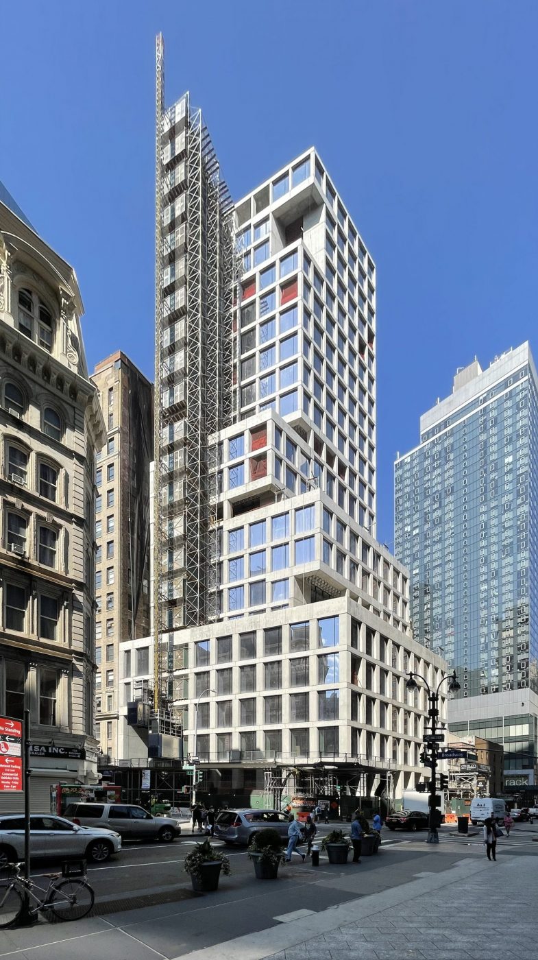 Façade installation is nearing completion on 1245 Broadway, a 23-story office building in NoMad. Designed by Skidmore Owings & Merrill and developed by GDSNY and Sweden-based Klövern AB, the 318-foot-tall building will yield 200,000 square feet of commercial space with leasing managed by CBRE. StructureTech NY and Triton Construction are in charge of constructing the Midtown, Manhattan project, which stands at the corner of West 31st Street and Broadway.