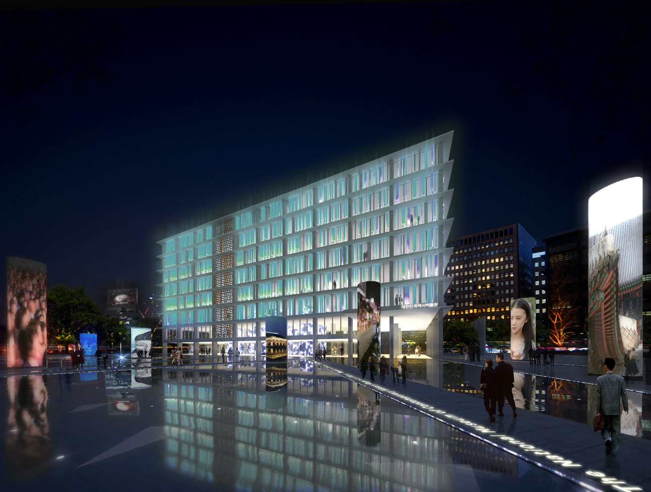 This critical narrative will be delivered through the use of state-of-the-art technology that allows visitors to contribute their own history to the collective archives. There will be a number of electronic ‘story collectors’ located around the museum that allow people to contribute their own histories using cell phones, recorded audio, video and touch pad technologies. Located both on-site and off-site, the accumulative data will be processed and broadcast as a key exhibit of the museum. This will include the opportunity for Koreans travelling abroad to submit their stories via the Internet, MMS and SMS, and allow visitors at the museum and in the Gwanghwamun Plaza to physically record their history in video booths, on touch pads and using their cell phones. A large-scale LED broadcast will occur on the main façade at the “Plaza of Contemporary History” located at the main reflecting pool at the museum’s entrance. Visitors are encouraged to talk to the building through texting technology, and in turn the building filters key words and phrases and responds to the visitor, establishing a real time “dialogue or conversation” on history. Individual story lines are recorded in streaming LED text strips that move towards the building, representing the flow of knowledge toward the museum, to be recorded for future generations… The water feature located below the energy-efficient LED broadcast board “reflects” the real-time narratives in a manner that mimics our own reflective thinking on history and provides a dynamic lighting system for the museum, drawing viewers in to participate in the reading and writing of their own history…