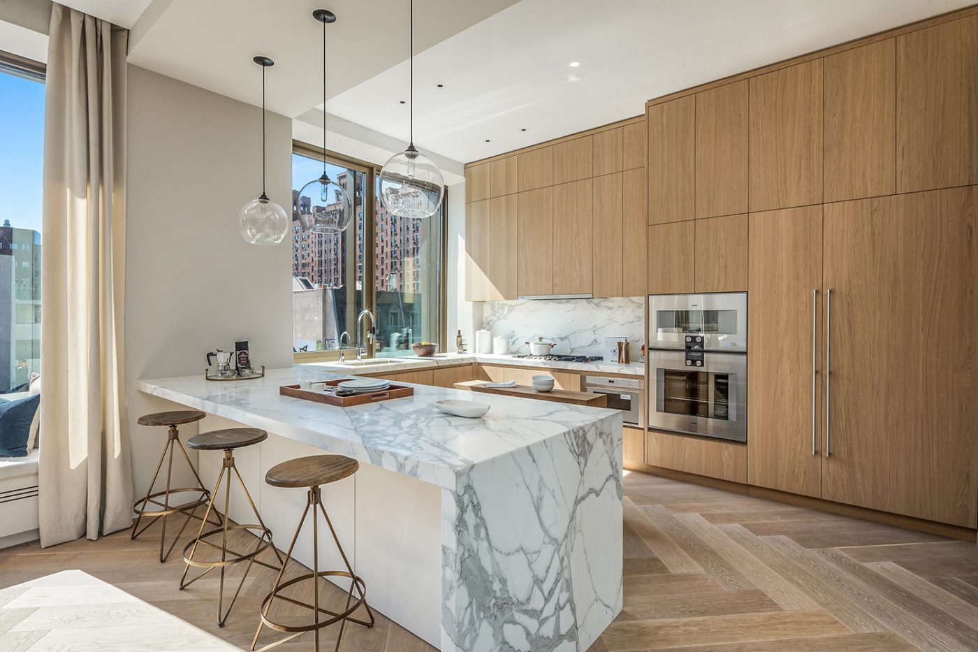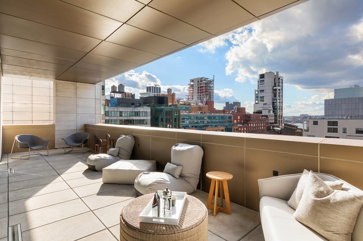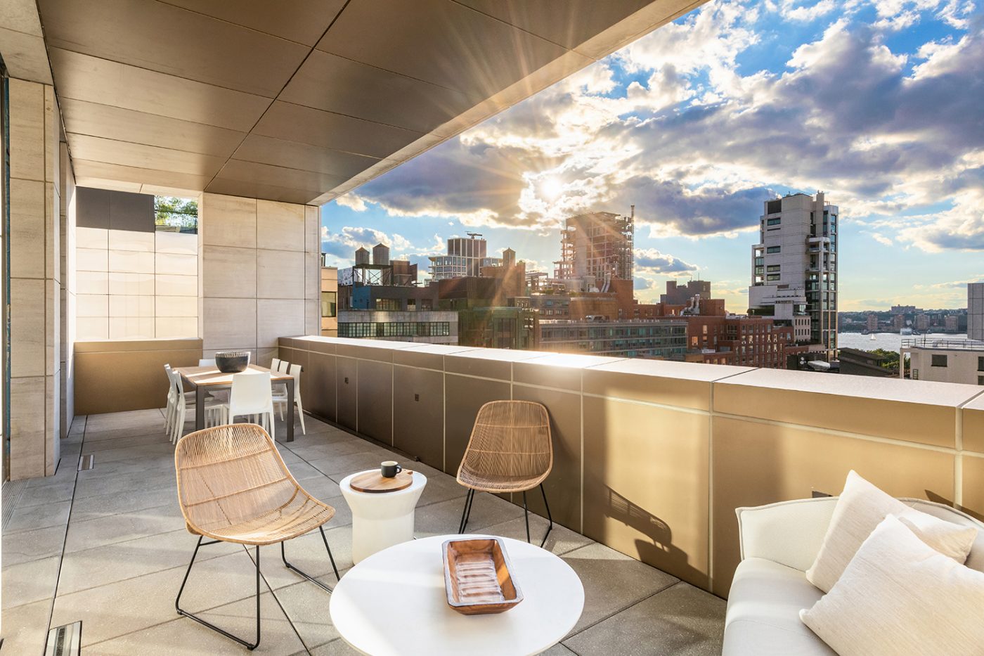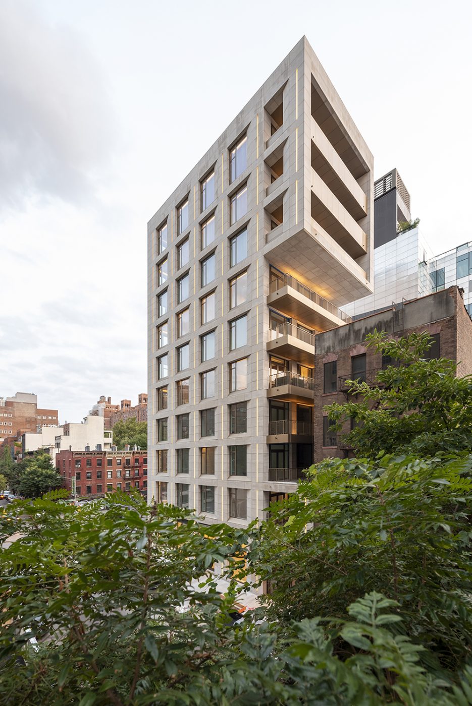 All apartments have ceiling heights of 10′-6″-12 feet, outdoor terraces, wide plank white oak wood floors, luxurious finishes, Gaggenau appliances, and imported marble kitchen countertops. Each living and bedroom in every apartment will have direct Highline views, and upper units will have views of the Hudson River, as well as the Empire State Building.