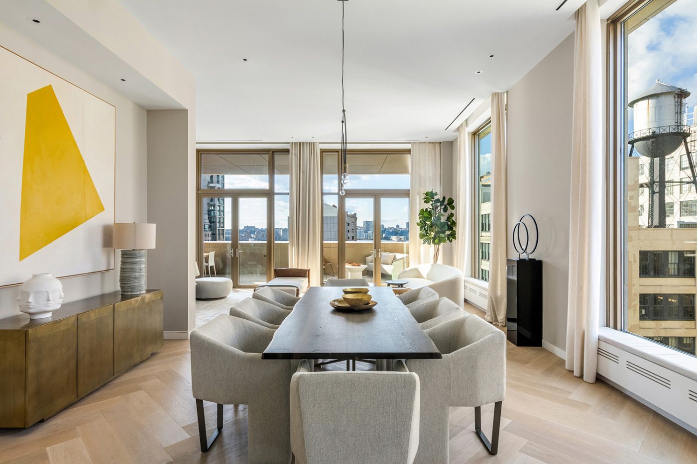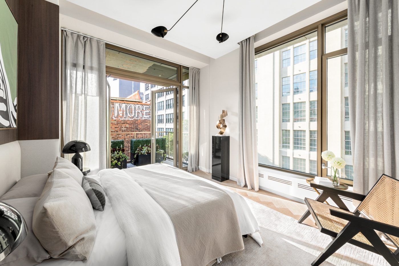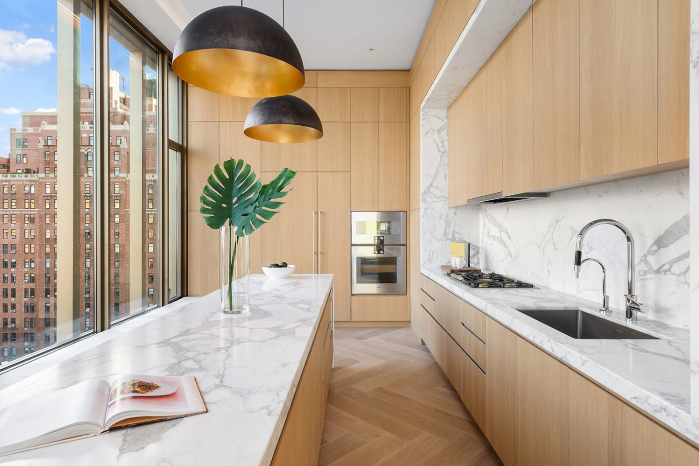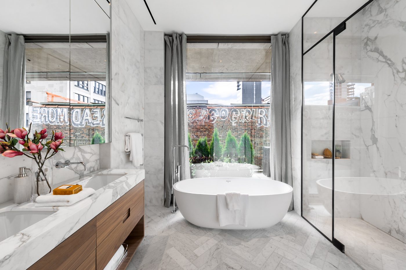 All apartments have ceiling heights of 10′-6″-12 feet, outdoor terraces, wide plank white oak wood floors, luxurious finishes, Gaggenau appliances, and imported marble kitchen countertops. Each living and bedroom in every apartment will have direct Highline views, and upper units will have views of the Hudson River, as well as the Empire State Building.