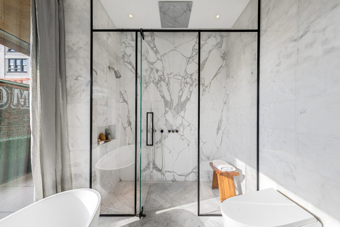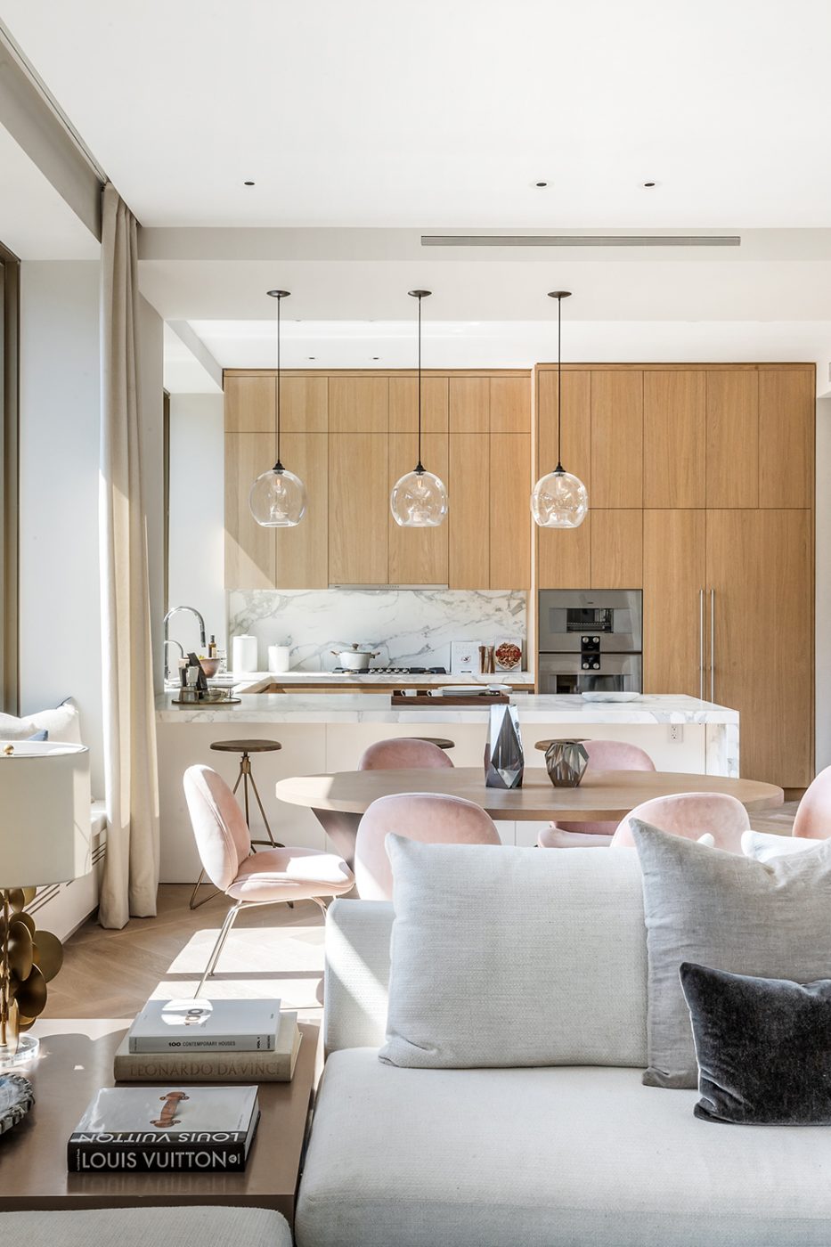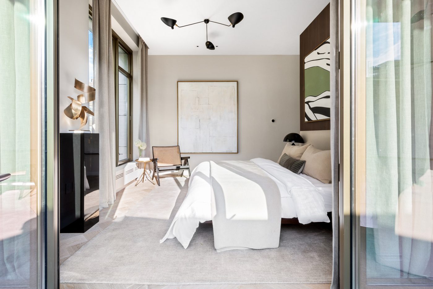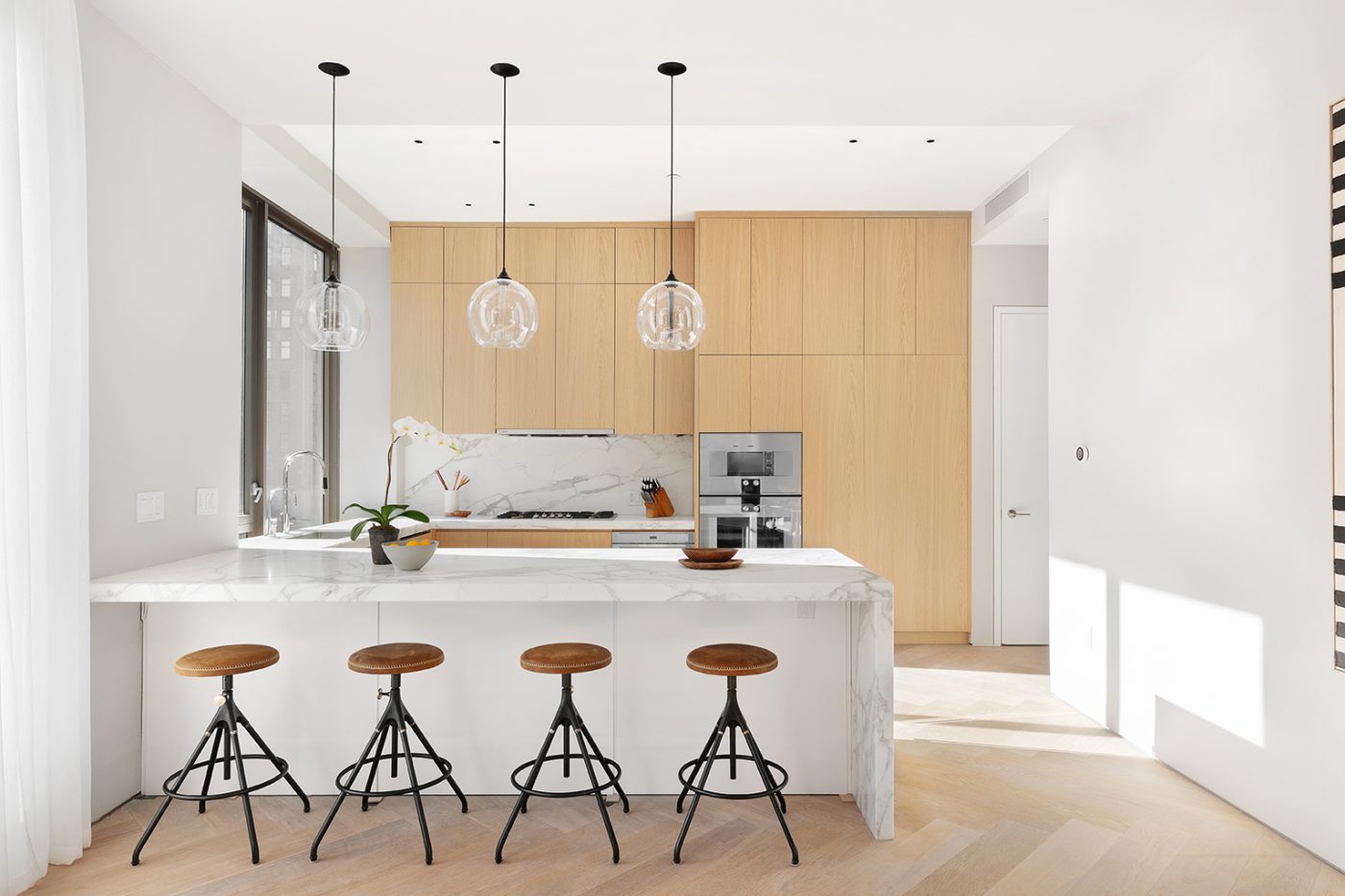 All apartments have ceiling heights of 10′-6″-12 feet, outdoor terraces, wide plank white oak wood floors, luxurious finishes, Gaggenau appliances, and imported marble kitchen countertops. Each living and bedroom in every apartment will have direct Highline views, and upper units will have views of the Hudson River, as well as the Empire State Building.