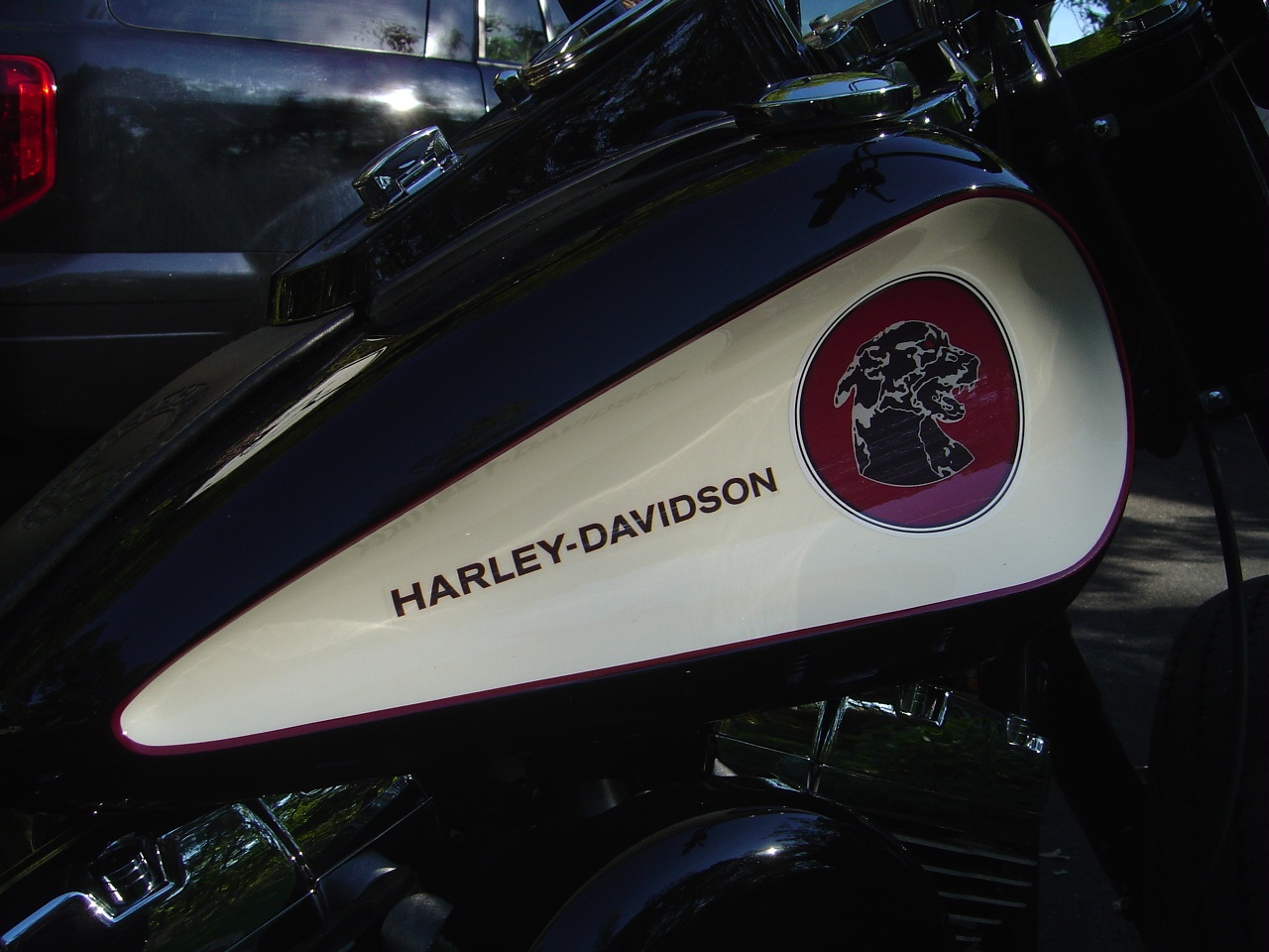 The design transformed a stock 2002 Harley Davidson Fatboy into a one of a kind custom chopper that features 16” ape hangers, 3.5” open primary belt, straight pipes with removed baffles, a custom round oil tank, a custom leather saddle, modified engine and fuel system, custom paint, a scalloped fuel tank, no mud guards and a branded mark and typography to accompany their corporate logos.