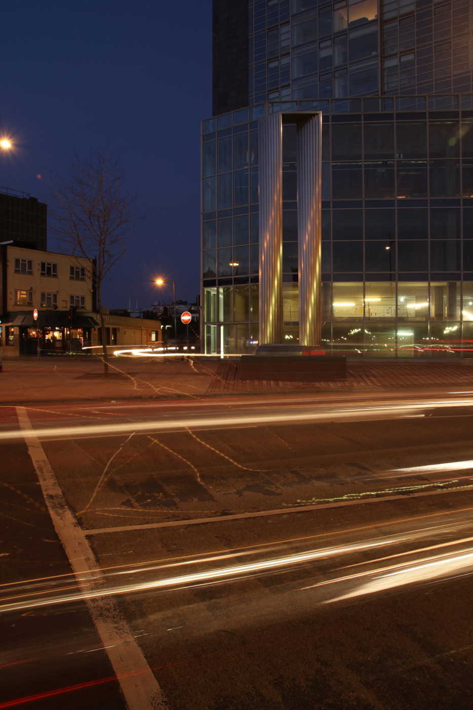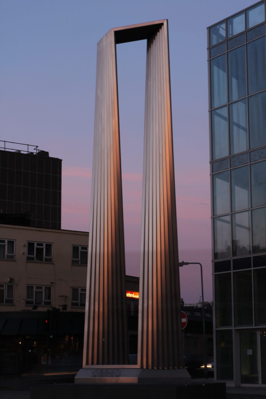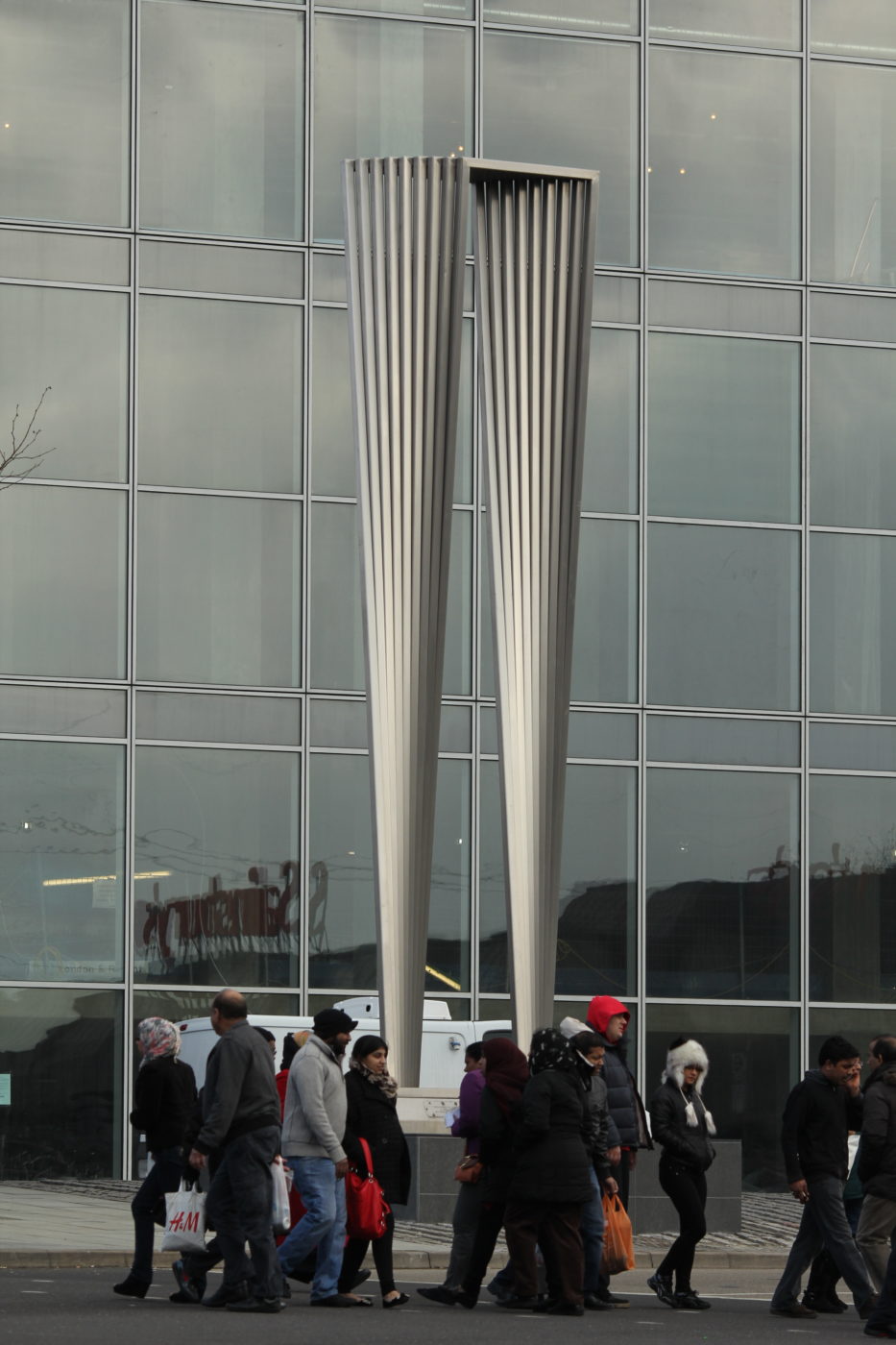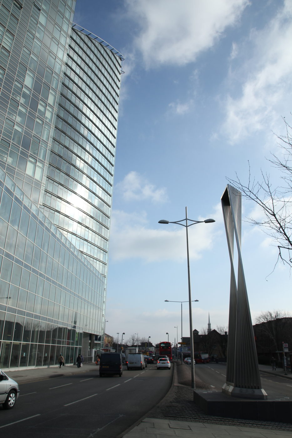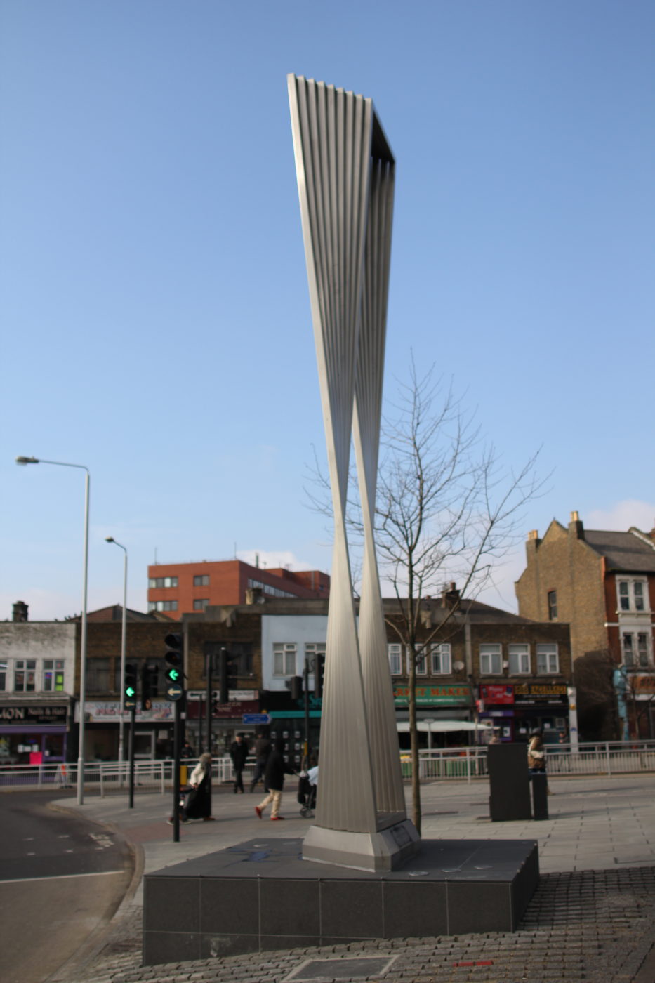 The sculpture, called Pioneer’s Gate, captures the period of exciting growth that is underway in Ilford, London. Pioneer’s Gate is made of nine reciprocally linked rectangular steel frames which nest and intersect each other, creating a vibrant elongated form that spirals upward, inspiring a sense of change and development. Located at a bustling intersection of pedestrian and vehicular traffic, Pioneer’s Gate offers a progression of views reminiscent of stop motion photography as one travels around the work. As Pioneer Point is a gateway to Ilford’s future, this sculpture stands as an opening to the imagination and spirit of those who will see it every day. Selected photos by Joe Hancock