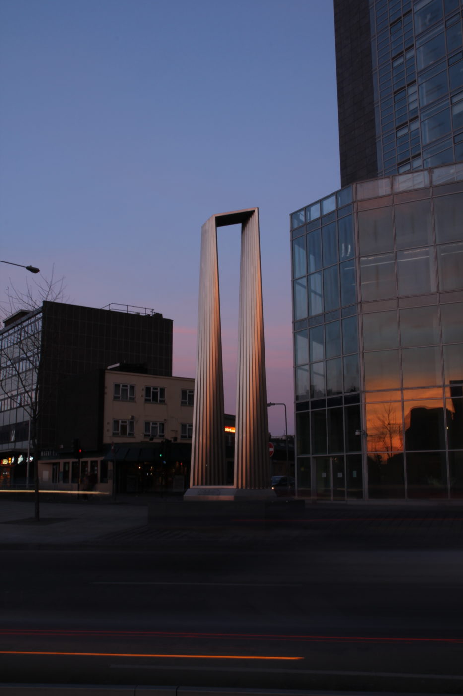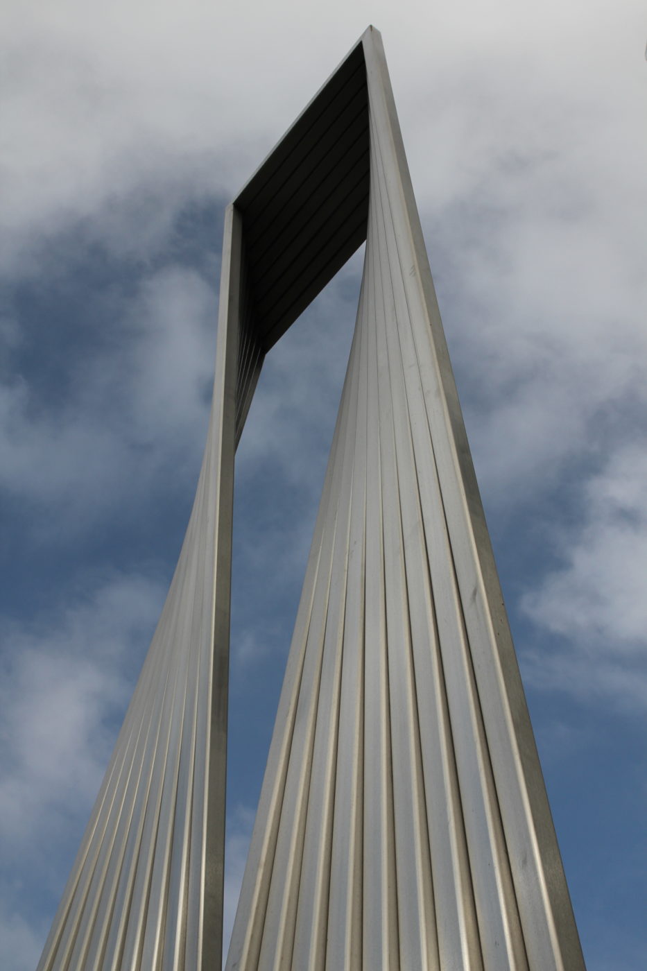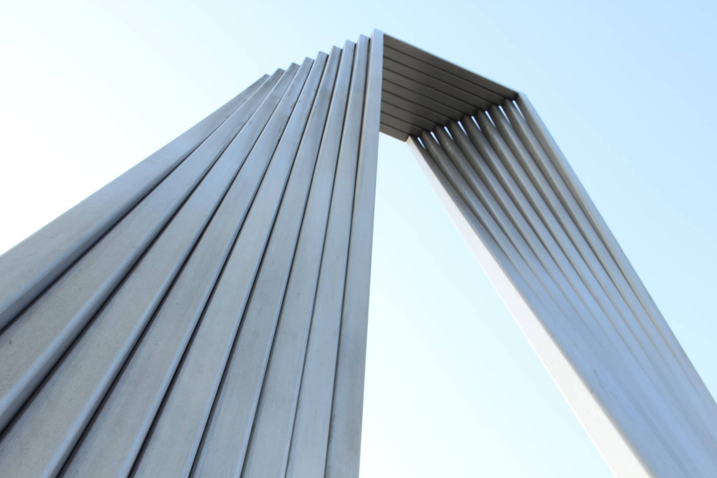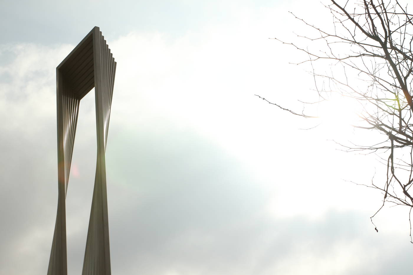 The sculpture, called Pioneer’s Gate, captures the period of exciting growth that is underway in Ilford, London. Pioneer’s Gate is made of nine reciprocally linked rectangular steel frames which nest and intersect each other, creating a vibrant elongated form that spirals upward, inspiring a sense of change and development. Located at a bustling intersection of pedestrian and vehicular traffic, Pioneer’s Gate offers a progression of views reminiscent of stop motion photography as one travels around the work. As Pioneer Point is a gateway to Ilford’s future, this sculpture stands as an opening to the imagination and spirit of those who will see it every day. Selected photos by Joe Hancock